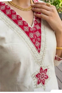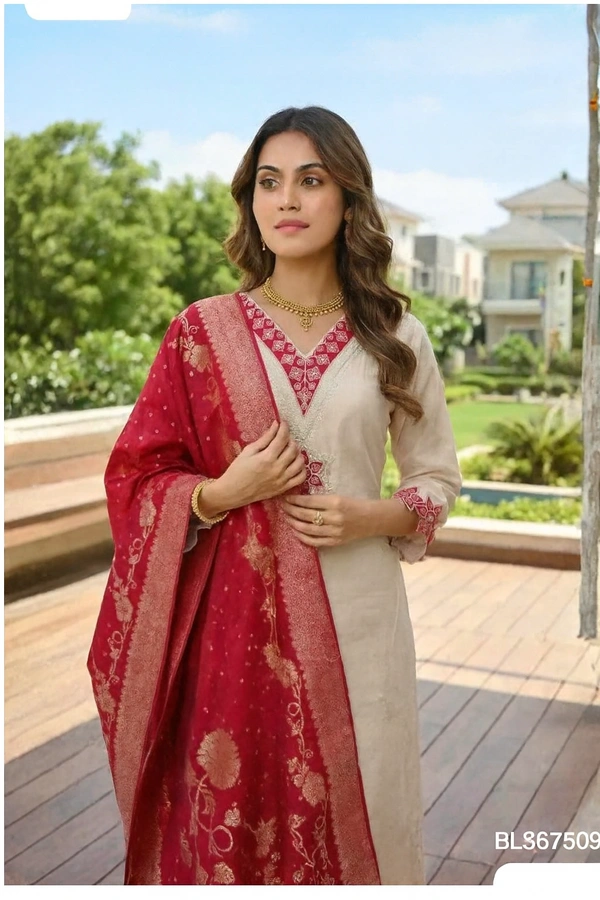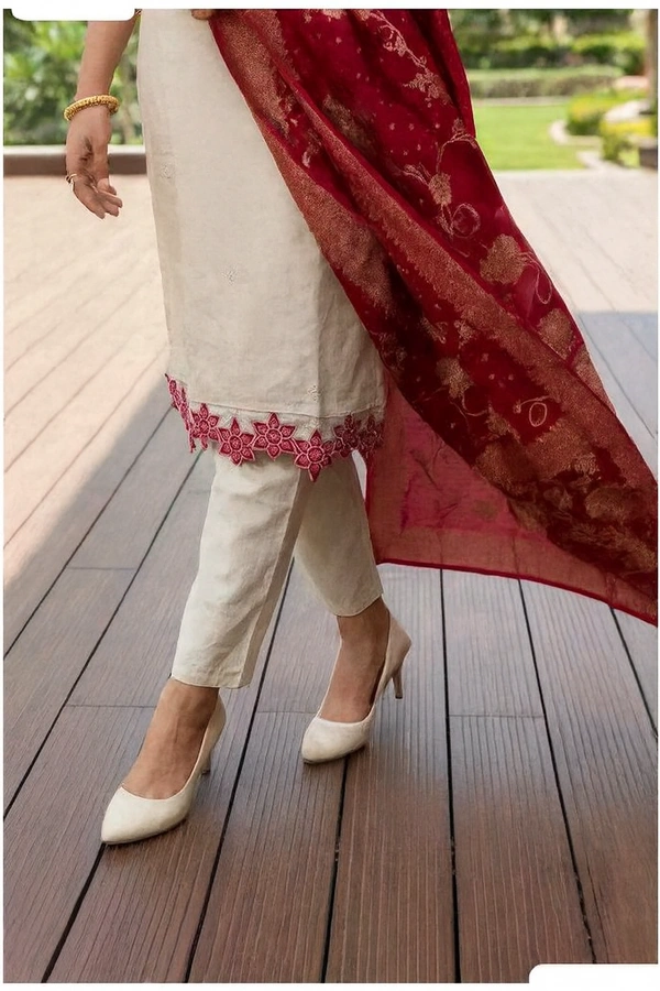 Key Highlights3-Piece Set: Kurta + Pant + Dupatta Kurta: Straight fit, embroidered V-neck, border detailing Sleeves: 3/4 sleeves with red border finish Bottom: Matching straight pants Dupatta: Rich red jacquard/printed dupatta (statement drape) Occasion: Festive, wedding functions, puja, family gatherings, evening wear