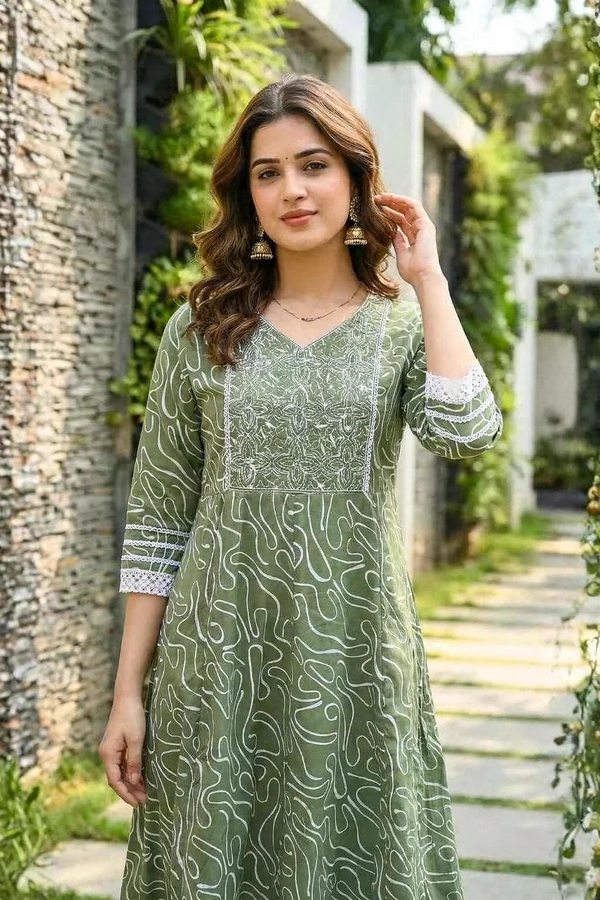 SpecificationsCategory: Women > Ethnic Wear Sub-Category: Kurta Sets / Suit Sets Type: 3-Piece Suit Set (Kurta + Pant + Dupatta) Brand: Bonclaire Color: Sage Green / Olive Green Neck: V-neck Sleeves: 3/4 sleeves Kurta Fit: A-line / Flared Bottom Type: Straight pants Pattern: Abstract print / All-over print Set Contents: 3 Pieces Wash Care: Gentle wash, mild detergent, dry in shade, low iron, do not bleach Country of Origin: India Fabric/Material: